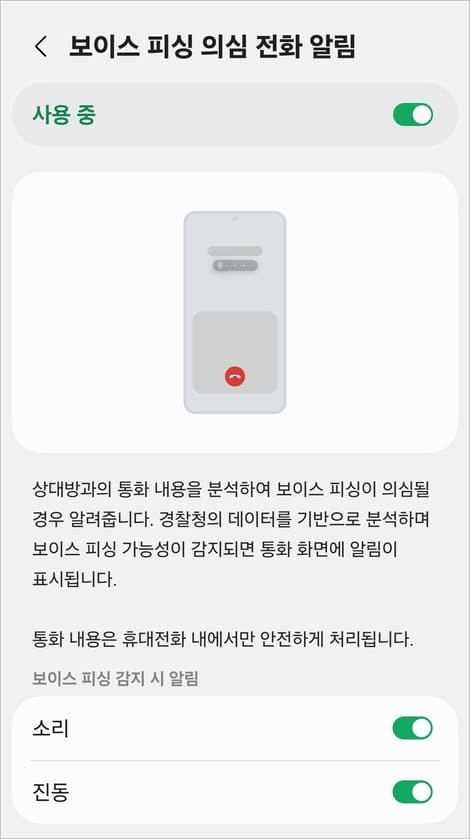 알 수 없는 전화에 대해서 통화를 AI가 경찰청의 데이터를 기반으로 분석하고 피싱으로 의심되는 대화 내용이 감지되면 피해가 없도록 알림으로 알려주고 통화 내용 분석은 기기에서만 처리되고 다른 곳에 공유되지 않습니다.