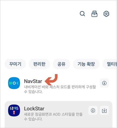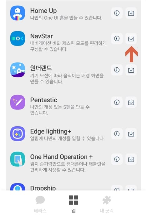 하단에 앱을 선택하고 NavStar 우측에 아래 화살표 방향 버튼을 눌러서 설치합니다.