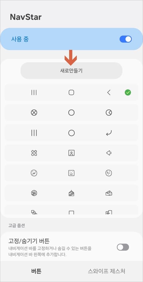 새로만들기 버튼 바로 아래 목록에서 추가한 버튼을 체크합니다.