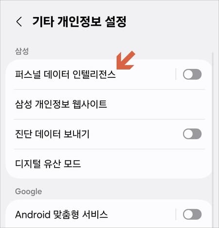상단을 보시면 퍼스털 데이터 인텔리전스가 표시되어 있는데요. 글자를 터치합니다.