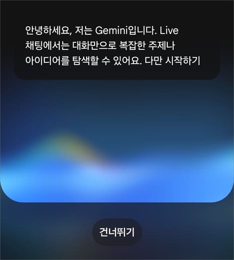 그럼 Gemini 라이브 채팅을 시작할 수 있습니다. 먼저 간략하게 안내 음성이 들리면 건너뛰기 버튼을 눌러줍니다.