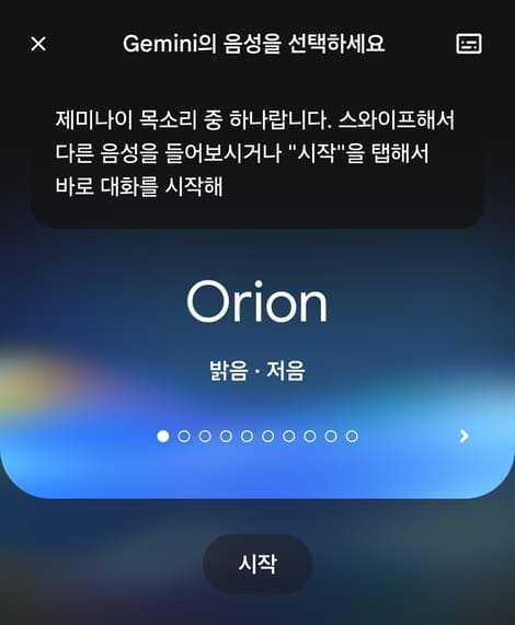 처음 제미나이 라이브를 시작하게 되면 전자 음성을 선택해 줘야 합니다.