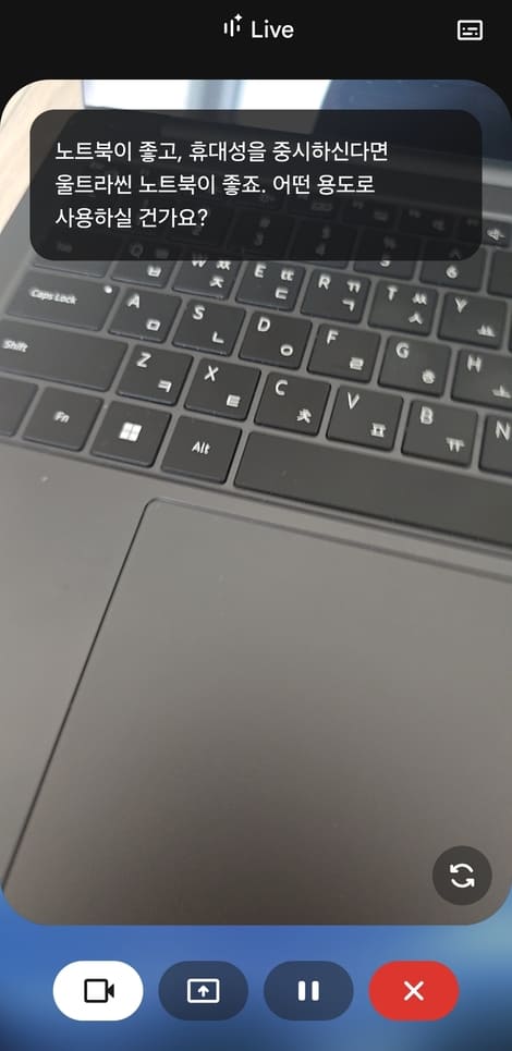 먼저 카메라 아이콘을 터치합니다. 보이는 화면을 기준으로 라이브 채팅을 시작하시면 됩니다. 예를 들어 화면에 보이는 건 뭔지 물어보면 상세하게 정보를 알려줍니다. 물론 100% 정확한 건 아니지만 현재까지는 뛰어난 성능을 보여주는 것 같습니다.