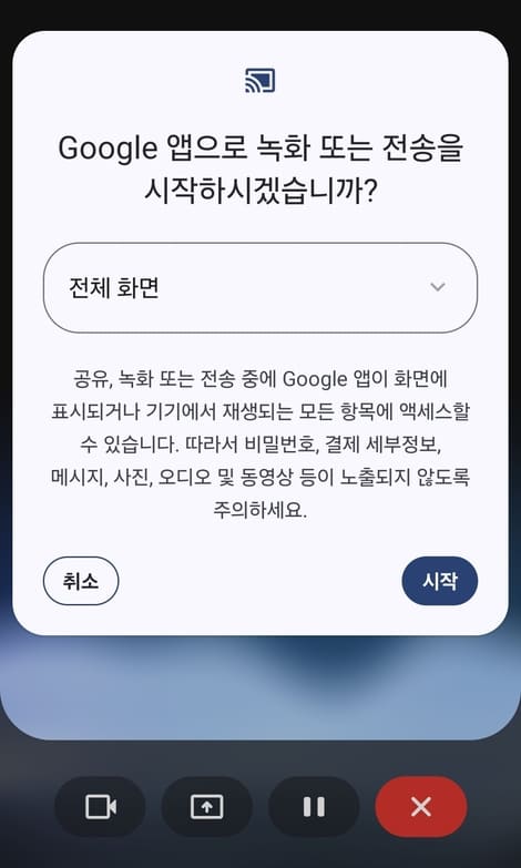 하단에 화살표 버튼을 누르시면 구글 앱으로 녹화 또는 전송을 시작할 수 있습니다. 공유, 녹화 또는 전송 중에 구글 앱이 화면에 표시되거나 기기에서 재생되는 모든 항목에 액세스할 수 있습니다.