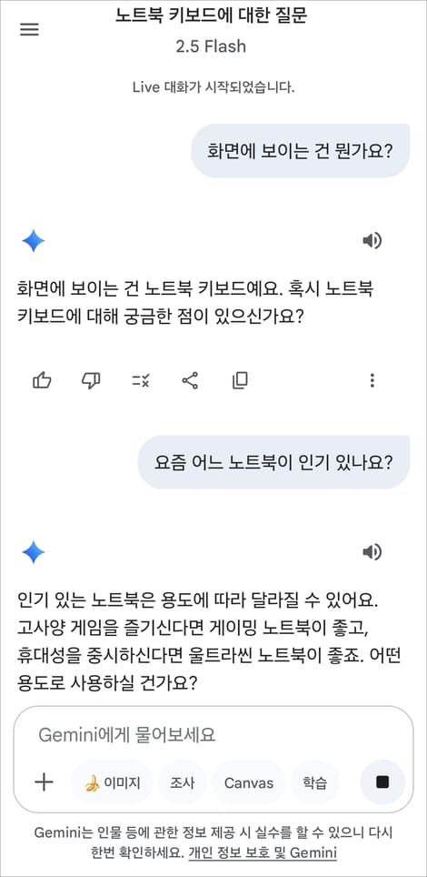 제미나이와 라이브 채팅하기는 Live 버튼을 탭하면 마이크가 켜지고 끄려면 중지 또는 종료 버튼을 터치하거나 음성으로 중지라고 말씀하시면 됩니다.