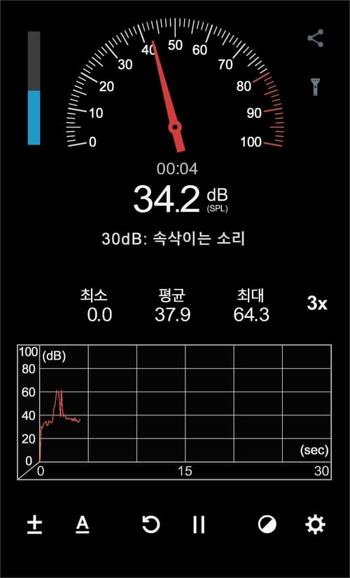 실시간 데시벨 수치와 최소, 평균, 최댓값을 확인할 수 있습니다. 화면 맨 하단을 보시면 이용 가능한 메뉴 아이콘들이 있는데요. 왼쪽부터 오른쪽 순입니다.