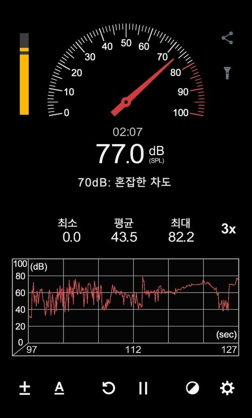 • 오차 보정(더하기 빼기 아이콘): 기기마다 마이크의 성능이 상이하므로 사용 전 데시벨 보정을 해줄 수 있음
