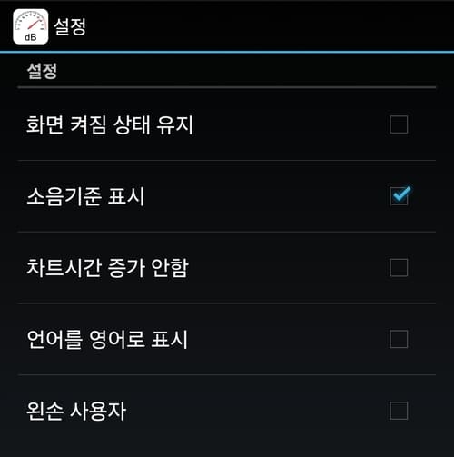 설정에서는 화면 켜짐 상태 유지, 소음기준 표시, 차트시간 증가 안 함, 언어, 왼손 사용자 등을 설정해 줄 수 있습니다.