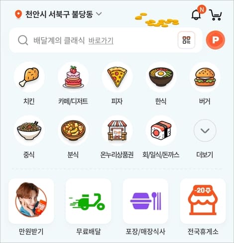 배달 주소지는 천안 지역으로 선택하고 메인 화면에서 주문할 카테고리 업종을 선택합니다.