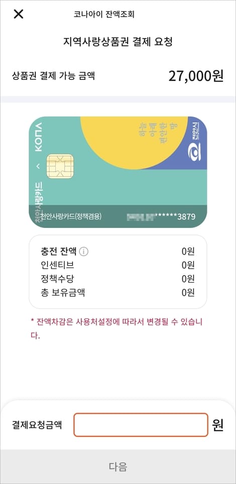 천안사랑카드 잔액이 부족할 경우 정상적인 결제가 진행되지 않으니 주문하기 전에 미리 충전 잔액을 확인하시고 부족할 경우 잔액을 보충한 후 결제하시면 됩니다.