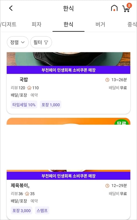 땡겨요 배달앱에서 부천페이 결제 가능한 가맹점은 쉽게 구분할 수 있습니다. 보통 매장 검색시 부천페이라고 표시되어 있습니다.