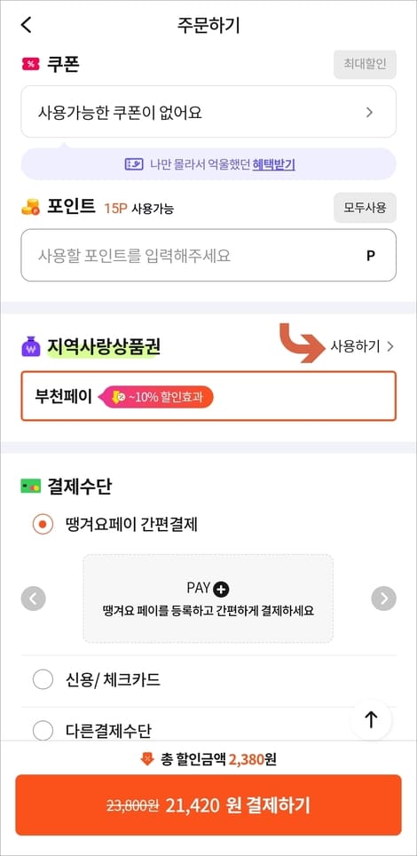 보유 예산 규모에 따라서 지자체마다 제공하는 혜택이 상이할 수 있으니 주문하려는 지역에서 지역화폐 결제 사용이 가능한지 한번 확인해 보세요. 참고로 부천페이는 경기지역화폐 앱에서 카드 신청과 충전 관리를 해줄 수 있습니다.