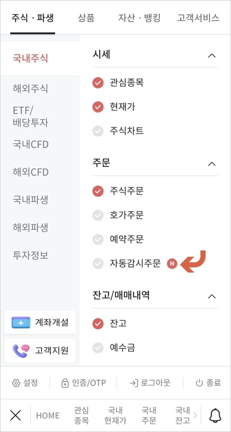 화면이 이동하면 국내주식에서 자동감시주문에 들어갑니다.