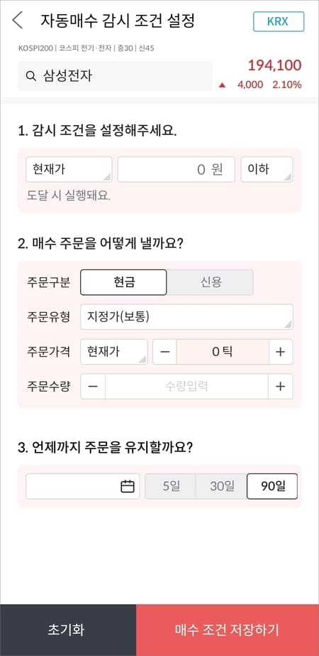 매도는 보유 종목을 선택해서 진행하면 되고, 매수에서는 상단에 종목 검색 선택하고, 감시 조건(현재가/시가/전일종가대비/등락률), 주문구분(현금/신용), 주문유형(지정가/시장가/조건부지정가/최유리지정가/최우선지정가), 주문가격, 주문수량, 주문 유지 기간을 설정한 다음 저장하기 버튼을 눌러주시면 됩니다.