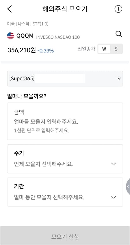 금액에서 1천원 단위로 입력하고 주기(언제 모을지), 기간(얼마 동안 모을지)을 선택 후 모으기 신청을 완료합니다.
