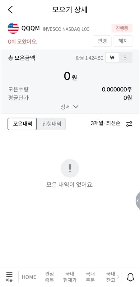 모으기 현황에서 신청한 주문 건을 선택하시면 변경, 해지를 해줄 수 있습니다.
