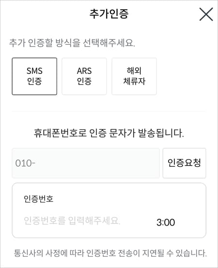 기존 한도보다 증액 상향하는 경우에는 문자인증/ARS 인증/해외체류자 중에 선택해서 추가인증을 거쳐야 합니다.