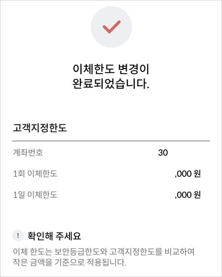 - 한번 설정하면 고정! 이체한도를 직접 설정한 이후에는, 나중에 보안등급이 바뀐다고 해서 한도가 자동으로 변하지 않습니다.