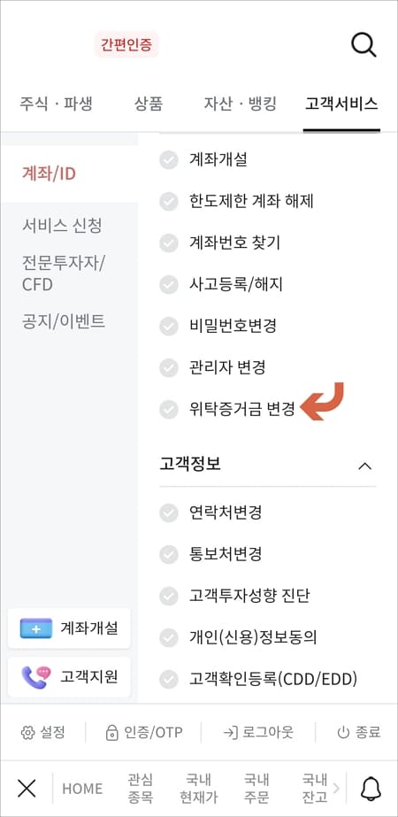 계좌/ID, 계좌관리 항목에서 위탁증거금 변경에 들어갑니다.