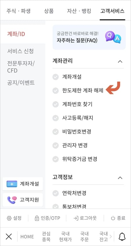 홈 화면 맨 하단 왼쪽에 3줄(≡) 메뉴를 눌러주고, 화면이 이동하면 상단에 고객서비스에서 계좌/ID 항목, 한도제한 계좌 해제에 들어갑니다.
