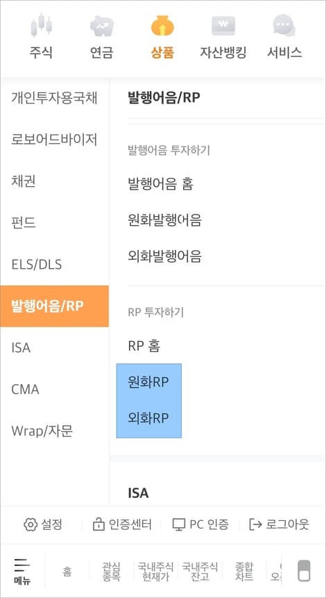 전체 화면으로 이동하면 상단에 상품을 선택하고 발행어음/RP 메뉴에서 원화 또는 외화RP를 선택합니다.