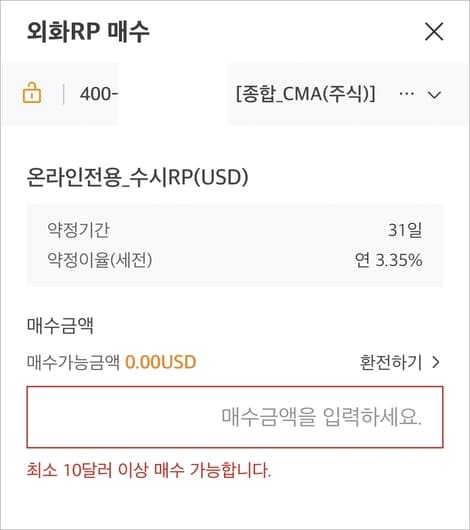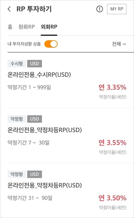 원화뿐만 아니라 외화RP도 투자할 수 있습니다. 잠깐 굴리고 싶은 달러/엔화/유로가 있다면 좋겠죠.