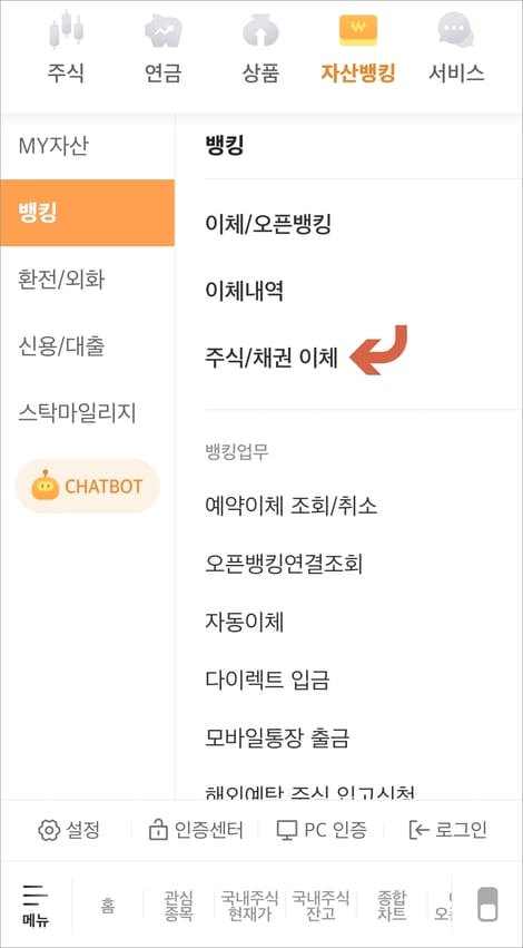 그리고 뱅킹 항목에서 주식/채권 이체를 선택합니다.