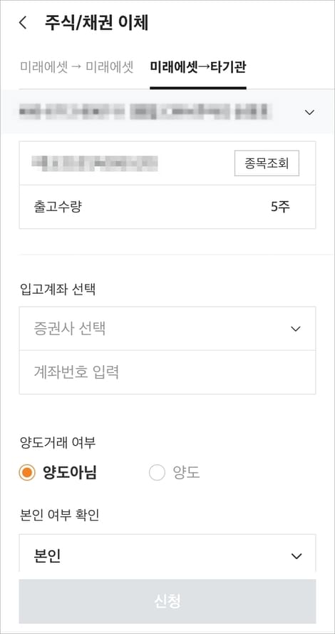 • 본인: 본인의 다른 계좌로 출고되는 경우