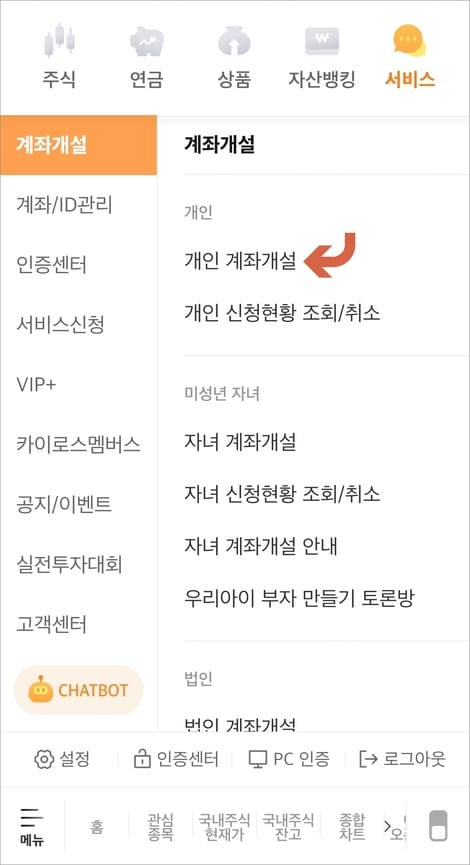 홈 화면 맨 하단 왼쪽에 메뉴(≡)를 터치하고 전체 화면으로 이동하면 상단에 서비스를 선택하고 계좌개설 항목에서 개인 계좌개설에 들어갑니다.
