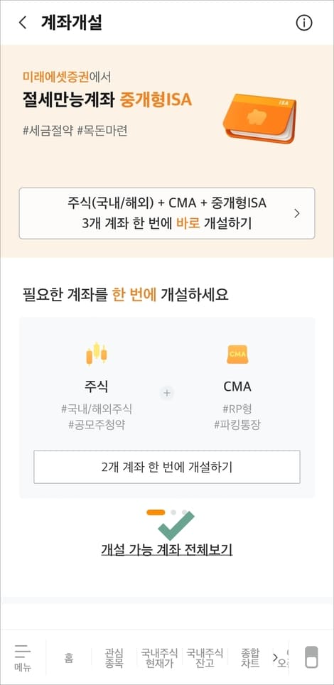 다수의 계좌개설이 필요하다면 화면에서 선택 후 한번에 진행하시면 되고 isa만 개설한다면 개설 가능 계좌 전체보기 글자를 터치합니다.