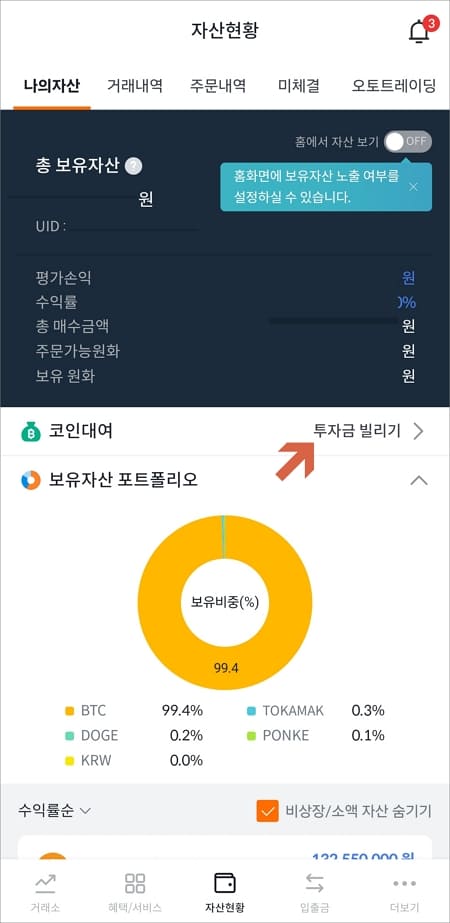 해당 화면으로 이동하면 코인대여 투자금 빌리기 글자를 터치합니다.