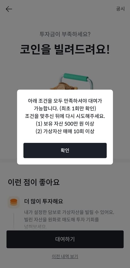 보유 자산 500만원 이상, 가상자산 매매 10회 이상 조건을 모두 만족한다면 대여가 가능합니다.