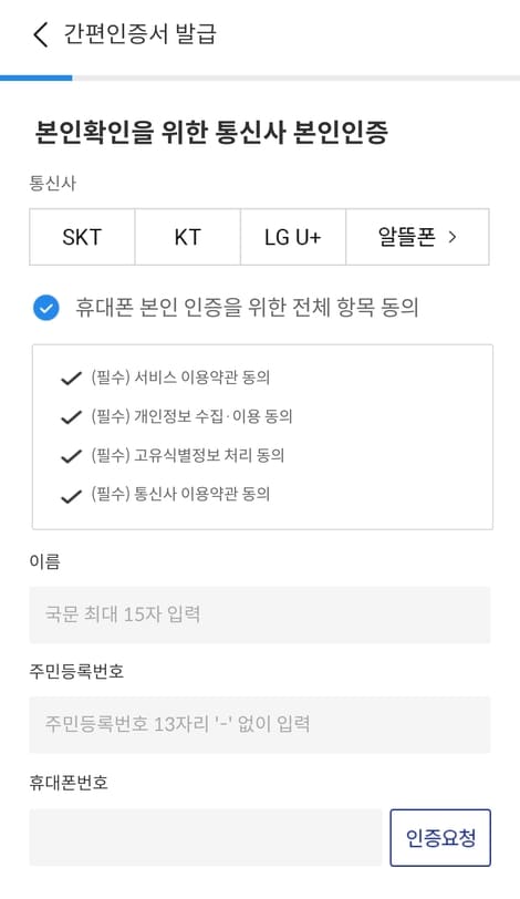 첫 번째 본인 인증으로 휴대폰 문자 인증을 진행합니다. 이름과 주민등록번호, 휴대폰 번호 입력하고 인증요청하시면 됩니다.