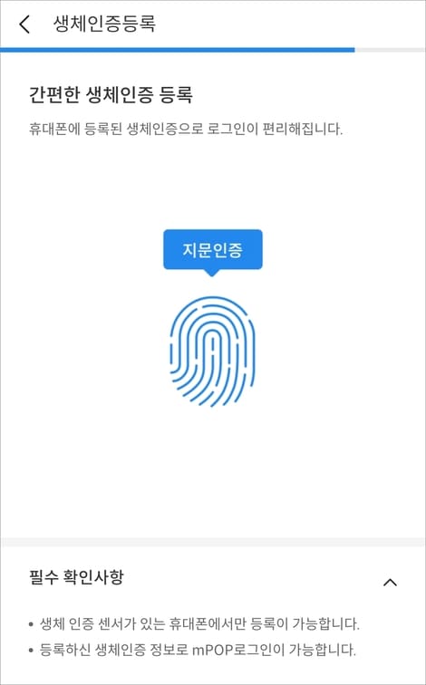 지문 인식 기능을 지원하는 기기라면 생체정보로 mPOP 앱 로그인을 할 수 있습니다.