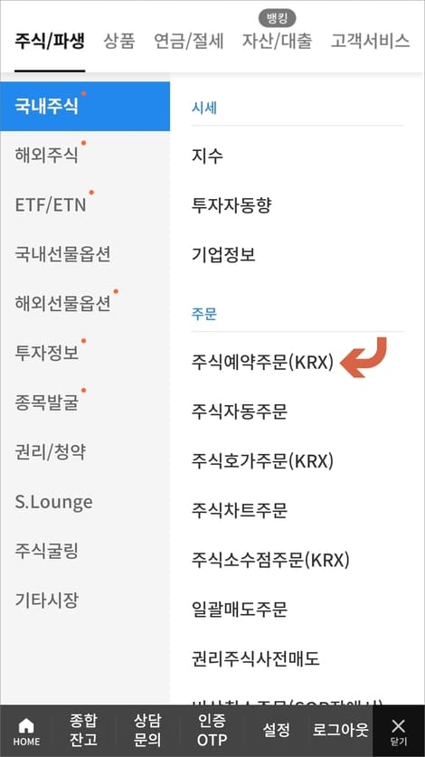 다음 화면 상단에 주식/파생을 선택하고 국내주식에서 주식예약주문(KRX)에 들어갑니다.