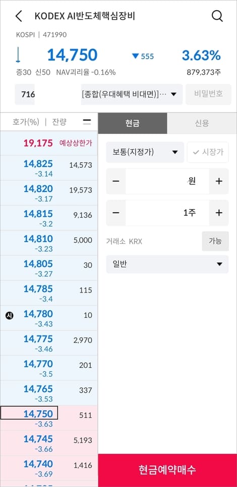 상단에 돋보기 아이콘을 눌러 주문할 종목을 검색해서 선택합니다.