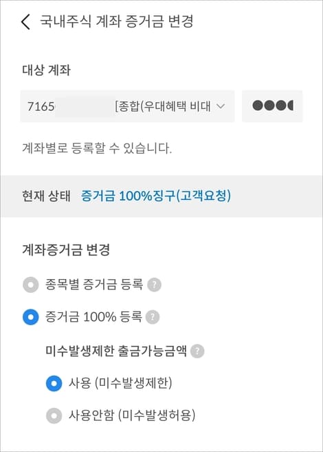 미수거래가 생기지 않게 하려면 증거금 100%로 변경 등록해 주시면 됩니다. 종합계좌에 한해서 계좌별로 등록 설정할 수 있습니다.