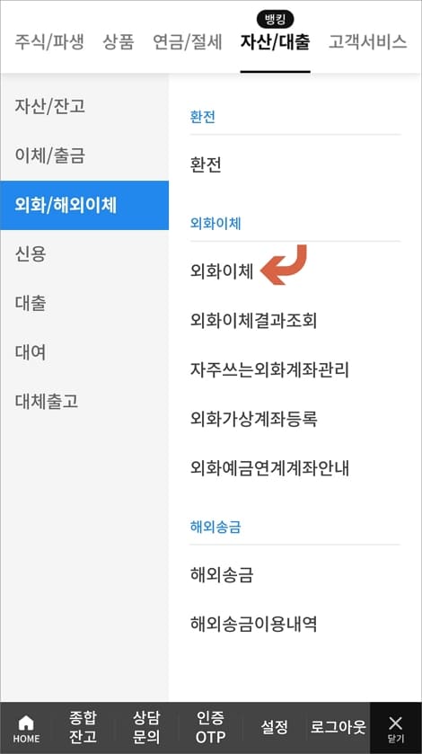 홈 화면 맨 하단에 메뉴(≡)를 터치하고, 해당 화면으로 이동하면 상단에 자산/대출을 선택하고 외화/해외이체에서 외화이체 메뉴를 선택합니다.