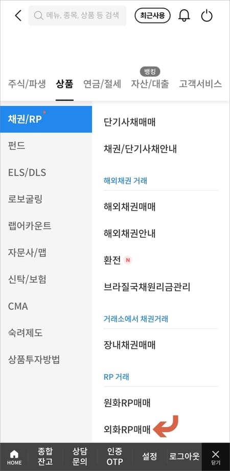상품 화면에서 채권/RP를 선택하고 우측 화면을 맨 아래로 내려서 외화RP매매에 들어갑니다.