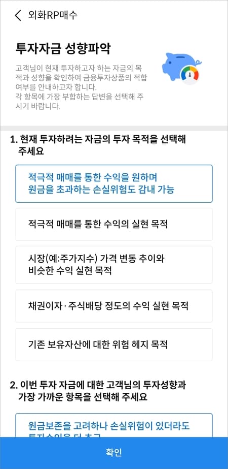먼저 투자자금 성향 파악 화면이 나오는데요.