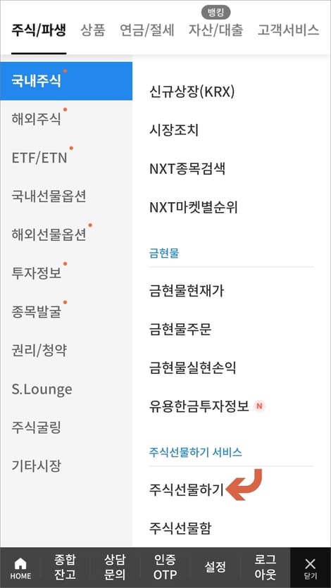 전체 메뉴 화면에서 국내주식을 선택하고 오른편 화면 맨 하단에 주식선물하기를 선택합니다.