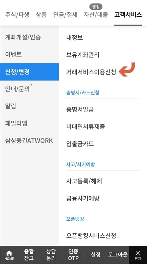 전체 메뉴 화면으로 이동하면 상단에 고객서비스를 선택하고 신청/변경에서 거래서비스이용신청에 들어갑니다.