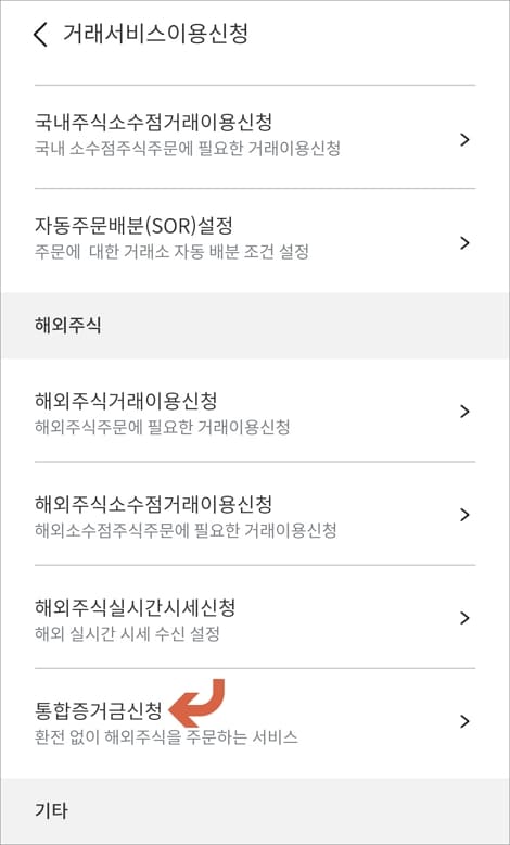 해외주식 항목에서 통합증거금 신청 메뉴를 선택합니다.
