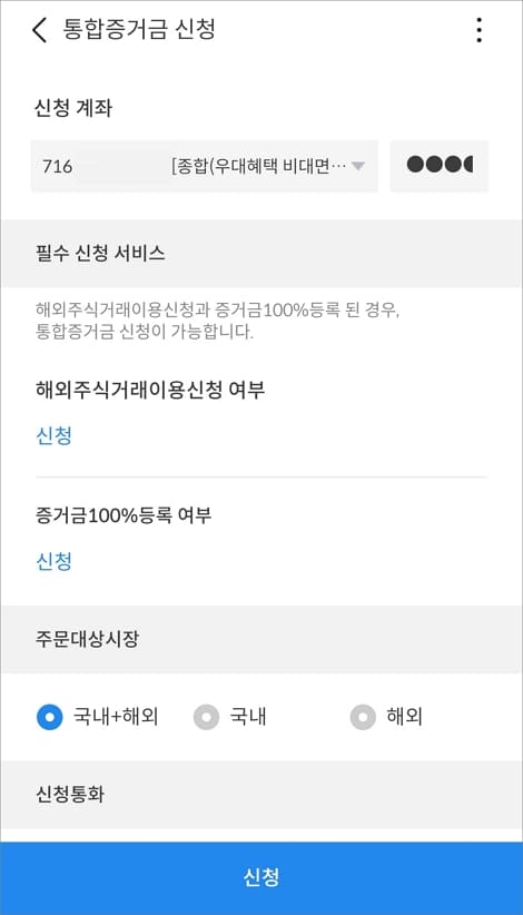 신청할 때 증거금을 공유할 시장 범위를 선택할 수 있습니다. 보통은 국내와 해외의 잔고를 모두 합쳐 자유롭게 쓰기 위해 국내+해외를 가장 많이 선택합니다.