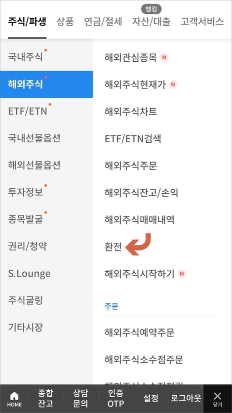상단에 주식/파생을 선택하고 해외주식에서 환전에 들어갑니다.