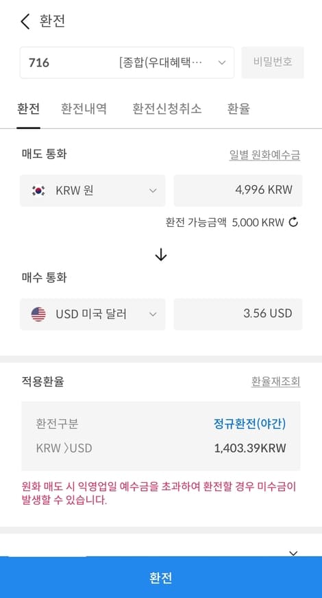 상단에 계좌를 선택하고 환전 가능금액을 확인 후 매도 통화 또는 매수 통화를 입력해서 환전하시면 됩니다.