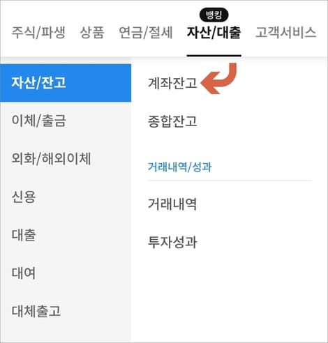 환전한 달러 예수금 잔액조회하려면 전체 메뉴 화면에서 상단에 자산/대출을 선택하고 자산/잔고에서 계좌잔고에 들어갑니다.