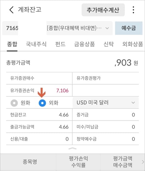 종합 탭에서 외화를 선택하시면 달러 현금잔고, 출금 가능 금액, 증거금, 미수금, 청약 예수금 등을 확인할 수 있습니다.