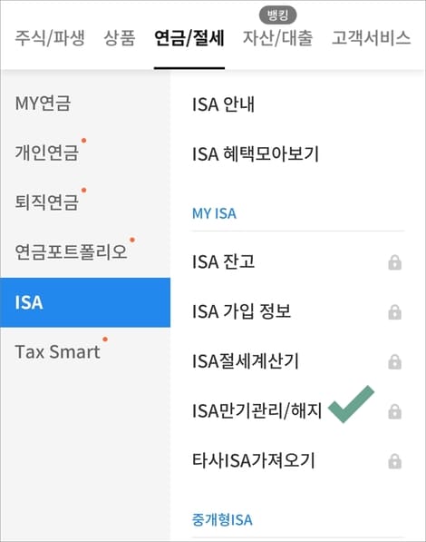 전체 메뉴 화면으로 이동하면 상단에 연금/절세를 선택하고 ISA 항목에서 ISA만기관리/해지에 들어갑니다.