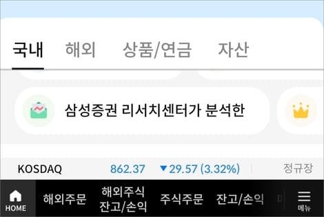 본인 휴대폰에서 삼성증권 mPOP 앱을 실행하고 로그인 후 홈 화면 맨 하단 우측에 메뉴(≡)를 터치합니다.
